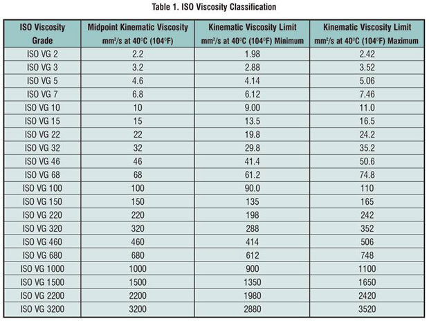 Această clasificare defineşte 20 de clase de viscozitate în domeniul de la 2 până la 2.300 mm2/s (1 mm2/s = 1 cSt) la 40°C (104°F). Fiecare clasă de viscozitate este desemnată prin numărul întreg, cel mai apropiat de punctul de mijloc al domeniului de viscozitate cinematică respectiv, exprimat în mm2/s la 40°C (104°F), şi este permis un domeniu extins cu ±10% din această valoare. Cele 20 de clase de viscozitate şi limitele lor specifice sunt listate în tabelul 1.