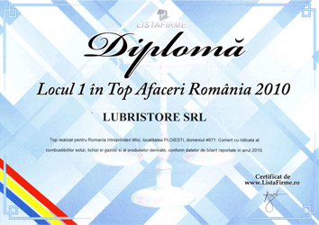 In anul 2010 eforturile si implicarea de care firma au dat dovada au fost recunoscute si de catre Lista Firme (www.listafirme.ro), Lubristore situandu-se pe locul 1 in Topul Firmelor private din Romania la sectiunea “Comertul cu ridicata al combustibililor solizi, lichizi si gazosi si al produselor derivate”.